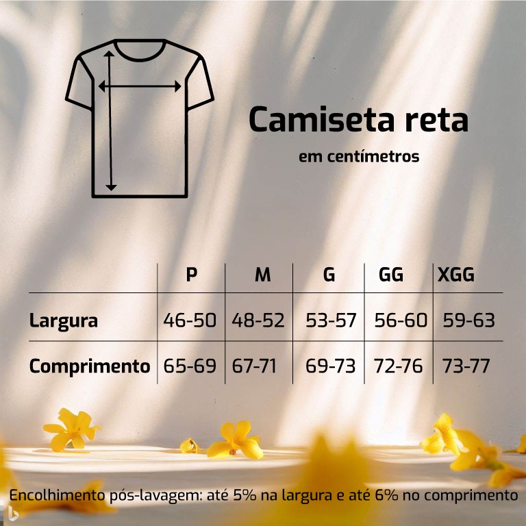 Cores do produto: Como cada tela de computador ou celular tem seu próprio jeito de mostrar cores, então a cor da sua camiseta e da estampa pode ser um pouco diferente do que você viu online.